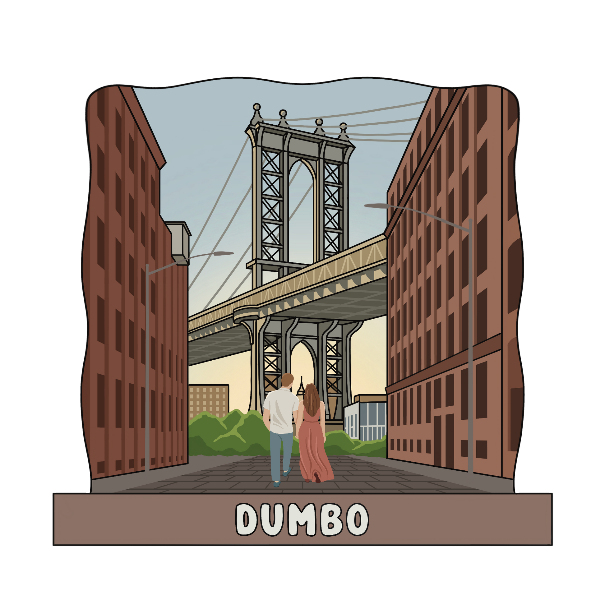 Capture the charm and iconic views of DUMBO, one of Brooklyn's most popular neighborhoods, with our DUMBO Wooden Magnet. This custom designed magnet showcases the breathtaking view of the Brooklyn Bridge as seen from the heart of DUMBO, with the two towering bridges framing a couple strolling hand-in-hand. Known for its trendy atmosphere, cobblestone streets, and art galleries, DUMBO is a must-visit area for anyone exploring Brooklyn. Made from premium wood, this magnet is durable, lightweight, and customizableÑmaking it the perfect souvenir or gift.